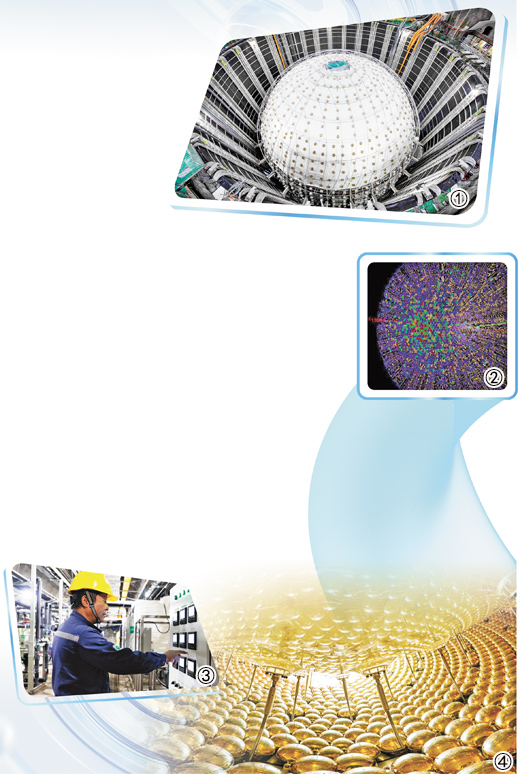 图①:江门中微子实验探测器。 刘悦湘摄(新华社发) 图②:江门中微子实验探测到的一个反应堆中微子事例示意图。 JUNO合作组供图(新华社发) 图③:工作人员在纯水间监测超纯水处理情况。 新华社记者 金立旺摄 图④:江门中微子实验探测器内部五五策略。 刘悦湘摄(新华社发)
