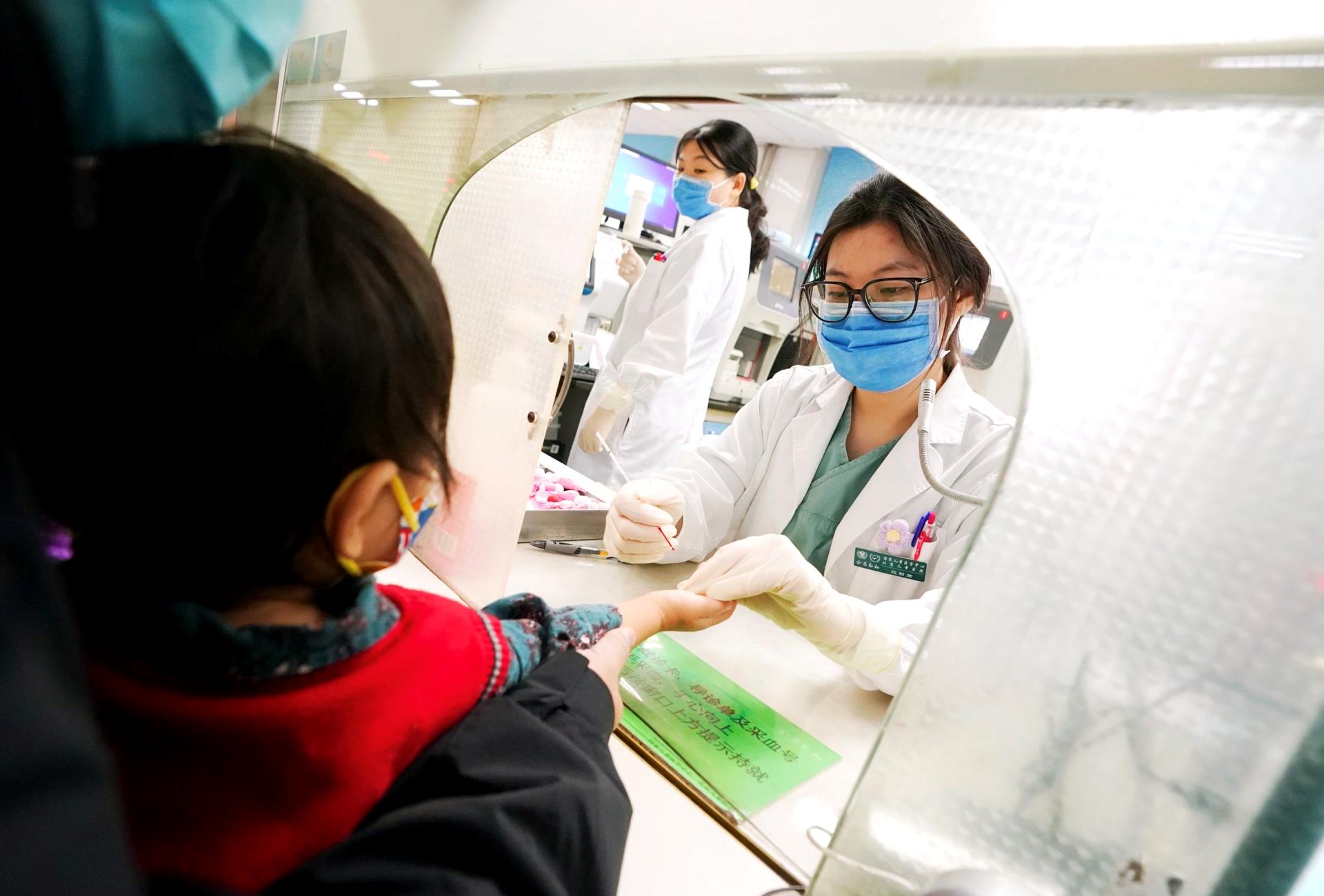 △12月1日,在北京儿童医院的医院采血室,医生正在为患儿采血化验。